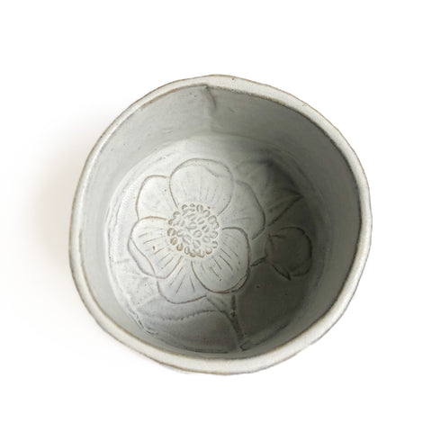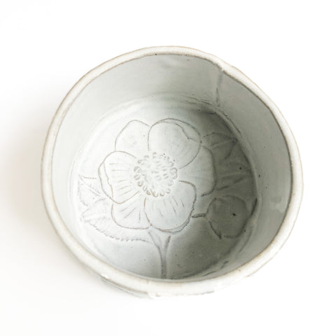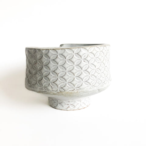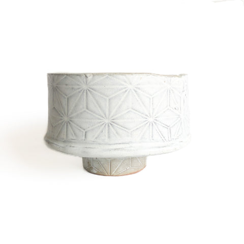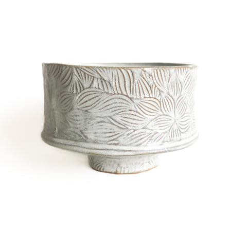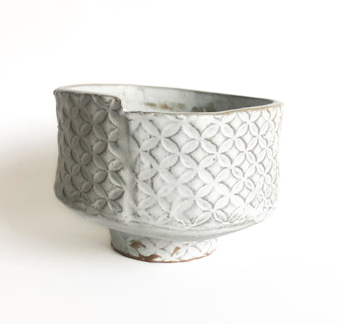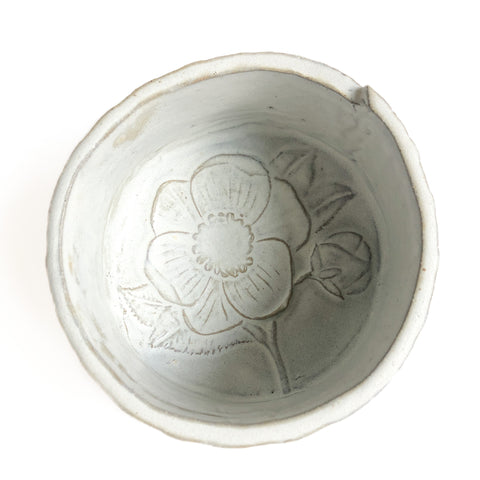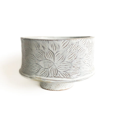 Made by a local artist, this bowl is hand-engraved with a leaf motif and is designed specifically for whisking matcha. Its green glaze with blue accents is embellished with yellow crystals and