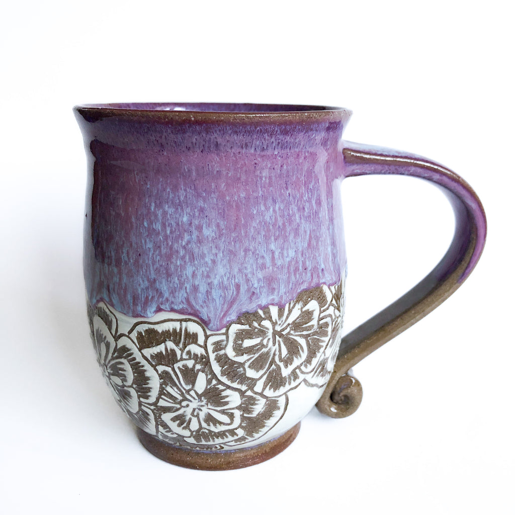 This cup is hand-thrown and engraved with a floral pattern inspired by marigolds. The pink glaze features accents of blue and opal, varying in intensity depending on the magical firing process, making each piece really unique. Medium in size, this cup is the perfect companion for a teapot or simply used with an infuser like this one.